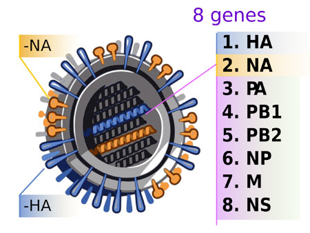 Khi người bị nhiễm vi-rút cúm A thì đáp ứng miễn dịch của cơ thể là đầu tiên đánh vào các kháng nguyên HA và thứ phát vào NA, nghĩa là trong cơ thể người sản sinh ra các kháng thể gắn kết trực tiếp vào các kháng nguyên HA của vi-rút và làm vô hiệu hoá vi-rút này làm cho cơ thể có thể không bị bệnh hoặc bị nhẹ nhưng vì một lý do nào đó, trong một đợt cúm mới cũng là một loại vi-rút đó nhưng cấu trúc HA hoặc NA thay đổi, khi đó cơ thể con người chưa kịp sản sinh ra các kháng thể đặc hiệu để có thể tiêu diệt được ngay vi-rút, khi đó bệnh có thể nặng và có thể thành dịch lớn nếu độc tố của kháng nguyên trong vi-rút mới này quá mạnh. Trong khi đó, vi-rút cúm A được cho là loại vi-rút không ổn định, với các kháng nguyên bề mặt HA và NA dễ biến đổi. Mặc dù việc HA và NA trong vi-rút được kiểm soát bởi một gen nhưng nhiều thành phần quan trọng khác của vi rút cúm được kiểm soát bằng nhiều gen hoặc sự tương tác của đa gen. Vì thế, các đột biến điểm hoặc các tái hợp di truyền mà có dính líu đến bất kỳ một trong 8 phân đoạn RNA nào của vi rút cúm nhóm A đều có thể có ảnh hưởng sâu rộng đến thay đổi trong vật chủ, vi rút và có nguy cơ tiềm tàng cho một đợt dịch cúm. Nhờ vào sự tiến bộ của các kỹ thuật sinh học phân tử, phân tích di truyền được cả 8 phân đoạn RNA của vi rút, đã mở ra một khung trời khám phá mới đầy thú vị liên quan đến việc đi truy tìm nguồn gốc của vi rút cúm và xây dựng các chiến lược phòng chống bệnh cúm nhóm A ở động vật. Nếu chúng ta có cách nào đó có thể tác động vào cấu trúc di truyền của vi-rút cúm A, làm cho chúng giữ ổn định cấu trúc và không đột biến thì chúng ta có thể kiểm soát được mức độ gây dịch.