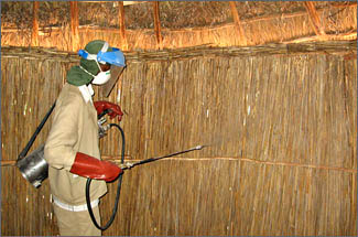 Việc phun thuốc diệt muỗi là phương pháp hiệu quả và nhanh chóng làm giảm mật độ muỗi. Việc phun thuốc diệt muỗi trong nhà có thể có hiệu quả diệt trừ muỗi trong thời gian từ 3 đến 6 tháng, tuỳ thuộc vào loại thuốc được sử dụng và loại bề mặt chất liệu mà thuốc được phun lên trên (DDT- dichloro diphenyl trichloroethane là loại thuốc có hiệu quả trong thời gian dài hơn, trong một số trường hợp hiệu quả diệt muỗi có thể lên đến 12 tháng). Hiện nay đã có một số loại hóa chất mới thay thế có hiệu quả phòng chống sốt rét rất cao.
