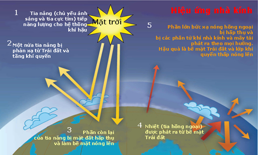 Hiệu ứng nhà kính (greenhouse effect) còn được gọi là sự nóng lên toàn cầu (global warming), thường được tích tụ bởi khí carbon dioxide (CO2) trong khí quyển.CO2 được tạo ra khi đốt cháy nhiên liệu, mặc dù cây xanh chuyển đổi CO2 trở lại với oxy (O2) nhưng việc phát thải khí CO2 từ các hoạt động của con người cao hơn so với mức thảm thực vật trên thế giới có thể xử lý.Tình trạng ô nhiễm không khí đang trở nên tồi tệ hơn vì nhiều khu rừng của trái đất đang bị xóa sổ và đời sống thực vật đang bị phá hủy bởi những cơn mưa axit làm cho lượng CO2 trong không khí ngày càng tiếp tục gia tăng, sự tích tụ này đóng vai trò như một tấm chăn và bẫy nhiệt gần bề mặt của trái đất chúng ta, từ đónhững thay đổi chỉ một vài độ cũng sẽ ảnh hưởng đến sức khỏe con người thông qua biến đổi khí hậu (climate change), thậm chí cả khả năng các núi băng vùng cực Bắc và cực Nam của trái đất có thể tan chảy làm gia tăng mực nước biển toàn cầu dẫn đến lũ lụt ven biển trên diện rộng. Các nguồn lực bổ sung và thông tin về hiệu ứng nhà kính và sự nóng lên toàn cầu có sẵn từQuỹ môi trường quốc phòng (Environmental Defense Fund_EDF), Học viện khoa học giáo dục vùng Vịnh (Science Education Academy of the Bay Area_SEABA)vàHiệp hội các tạp chí môi trường (Society of Environmental Journalists_SEJ).