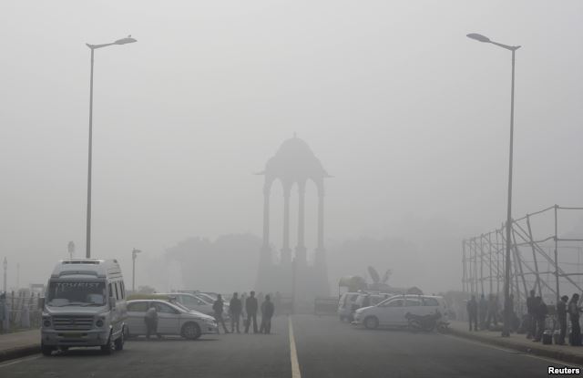 Những người bán hàng rong dạo bên cạnh các phương tiện gần đài tưởng niệm Inda Gate trong một ngày sương mù tại New Delhi, ngày 01/02/2013