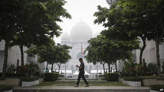 Một người đàn ông Malaysia đi bộ qua Palace of Justice (Tòa nhà Công Lý) bị bao phủ bởi khói bụi tại Putrajaya, Malaysia, ngày 11/9/2015