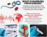 Virus Marburg là loại virus rất nguy hiểm, xét về độ kịch độc thì Marburg gần như không tác nhân gây bệnh nào có đối thủ. Nếu như Dengue, Zika thuộc họ Flaviviridae chỉ thuộc nhóm nguy cơ số 2, tức không quá nghiêm trọng và có thể điều trị, phòng ngừa thì Marburg lại được xếp vào nhóm nguy cơ số 4. Virus Marburg lây truyền từ vật chủ động vật sang người (zoonosis). Marburg và Ebola là virus cùng họ Filoviridae. Đây là hai bệnh hiếm gặp, nhưng có thể bùng phát mạnh, tử vong cao.