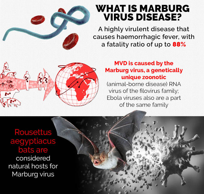 Giống như Ebola, virus Marburg bắt nguồn từ loài dơi và lây lan giữa người với người qua tiếp xúc gần với chất dịch cơ thể của người bị nhiễm bệnh hoặc các bề mặt, chẳng hạn như ga trải giường nhiễm virus.Theo các CDC, bệnh Marburg do virus Marburg gây ra là một loại sốt xuất huyết có thể ảnh hưởng đến các cơ quan của cơ thể và gây chảy máu.Theo CDC Mỹ, virus Marburg là một loại virus lây truyền từ động vật sang người, cùng với 6 loại virus Ebola tạo nên họ filovirus.