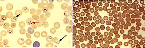 Babesia microti thể nhẫn trong hồng cầu (trong mũi tên ngắn), thể nhẫn ngoại hồng cầu(mũi tên dài) và một thể maltese chéo “Maltese cross” (mũi tên đỏ) (qua tiêu bản nhuộm Giemsa độ phóng đại ×100). |