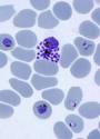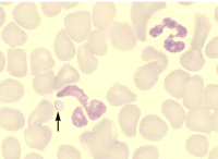 Hình ảnh phôi dâu của Anaplasma phagocytophilum trong bào tương của bạch cầu đa nhân trung tính (mũi tên) (Nhuộm Wright, độ phóng đại x 100) |