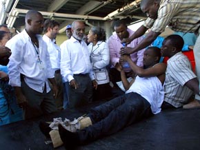 TTO - Chính quyền Haiti cho biết số người chết trong trận động đất ngày 12-1 có thể vượt qua 100.000 người. Liên Hiệp Quốc (LHQ) công bố ít nhất 16 trong số 9.000 thành viên gìn giữ hòa bình LHQ ở Haiti thiệt mạng, 150 người mất tích. AP cho biết ở thủ đô Port-au-Prince, hàng nghìn người bị thương vẫn phải ngồi chờ được chữa trị bên ngoài các bệnh viện đổ nát. “Tôi không thể chịu nổi nữa, lưng tôi đau đớn vô cùng”, anh Alex Georges gắng gượng nói. Anh đã chờ từ hơn một ngày qua nhưng vẫn chưa được chữa trị.