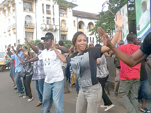 Các vũ công thực hiện trong một flashmob ở trung tâm thành phố Freetown, Sierra Leone, ngày 14/10/2013 . ( N.deVries / VOA ) |