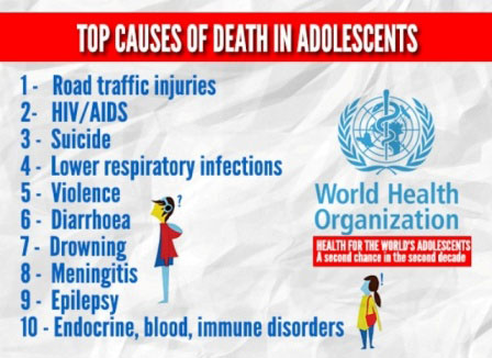 Trong 10 nguyên nhân hàng đầu xếp theo thứ tự của WHO bao gồm tai nạn giao thông đường bộ, HIV/AIDS, tự tử, nhiễm trùng đường hô hấp dưới, bạo lực, bệnh tiêu chảy, chết đuối, viêm màng não (meningitis), động kinh (epilepsy);rối loạn nội tiết, máu, miễn dịch (endocrine, blood, immune disorders). WHO ước tính 1,2 triệu thanh thiếu niên chết trong năm 2015 tương đương với trên 3.000người/mỗi ngày, chủ yếu từ các nguyên nhân có thể phòng tránh hoặc điều trị được. Trong đó,tai nạn giao thông đường bộ là nguyên nhân gây tử vong hàng đầu,theo đó là các nguyên nhân khác.Trên thế giới có 49 ca sinh/1.000 trẻ gái từ 15 đến 19 tuổi mỗi năm. Trẻ vị thành niên chiếmmột nửa của tất cả rối loạn sức khoẻ tâm thần bắt đầu từ 14 tuổi nhưng hầu hết các trường hợp đều không được phát hiện và điều trị.