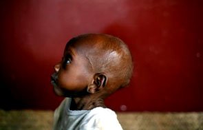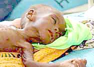 | Waka,2 tuổi-một đứa trẻ bị suy dinh dưỡng nghiêm trọng ngồi trên sàn nhà tại trung tâm nhi khoa Bangui ở Bangui, Cộng hòa Trung Phi, thứ 3 ngày 17/12/2013 |