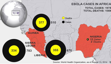 Theo thông tin mới nhất của Tổ chức Y tế thế giới (WHO) từ khi dịch bệnh Ebola bùng phát từ tháng 3/2014 đến nay đã có tổng cộng 1.975 người nhiễm bệnh và 1.069 người chết do dịch bệnh này ở 4 nước Tây Phi: Guinea, Liberia, Sierra Leone và Nigeria.