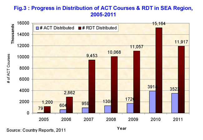 Sự chuyển hướng trong cách chẩn đoán sốt rét bằng test chẩn đoán nhanh (RDTs) là một bước tiến trong công tác PCSR bởi vì nó cho phép tập trung sử dụng thuốc ACTs cho những người thật sự mắc bệnh. Mục đích của việc này là nhằm giảm sự bùng phát và lan rộng của tình trạng kháng thuốc trong cộng đồng và giúp loại ra những bệnh nhân có triệu chứng sốt nhưng không mang mầm bệnh sốt rét, từ đó chuyển đổi cách chẩn đoán và điều trị thích hợp. Mặt khác, kiểm soát sốt rét tốt đồng thời cũng sẽ có tác động đến việc kiểm soát các bệnh khác ở trẻ em, nhờ đó tăng khả năng sống của trẻ. WHO hiện đang hỗ trợ những quốc gia có sốt rét lưu hành cải thiện chất lượng dịch vụ chẩn đoán sốt rét bằng kính hiển vi và RTDs, đồng thời khuyến khích các nhà sản xuất RDTs tiếp tục cải thiện độ chính xác và chất lượng của chúng. Theo ước tính của WHO có khoảng 80 quốc gia hiện đang sử dụng thuốc ACTs tại tuyến y tế cơ sở để phục vụ cho công tác điều trị sốt rét P. falciparum. Trong hướng dẫn mới này, WHO cũng nhấn mạnh đến tầm quan trọng của việc điều trị theo thuốc ACTs đối với thể ác tính của bệnh. Đồng thời, WHO đã thêm ACTs thế hệ thứ 5 - là sự kết hợp giữa dihydroartemisinin và piperaquin phosphate vào danh sách thuốc điều trị sốt rét.