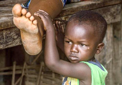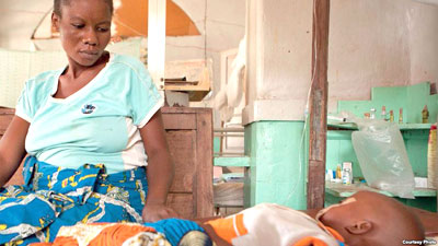 Antho đang trông nom con trai mình Kaba, hai tuổi, đang được điều trị sốt rét thể não tại Bệnh Viện Tshilundu Referral tại tỉnh Kasai Oriental, Cộng hòa Dân chủ Congo (DRC). Antho đang mang bầu chín tháng tuổi. Đây là lần mang bầu thứ tám của cô; cô đã sẩy thai hai lần và một đứa con gái đã mất vì sốt rét lúc mới mười một tháng tuổi vì phòng khám nơi họ đưa con bé tới đã đóng cửa lúc đó. Đây không phải là điều bình thường: nhiều phòng khám địa phương tại DRC không có đủ trang thiết bị và nhân viên cần thiết. (Hình do Ivy Lahon/Save the Children cung cấp) |
