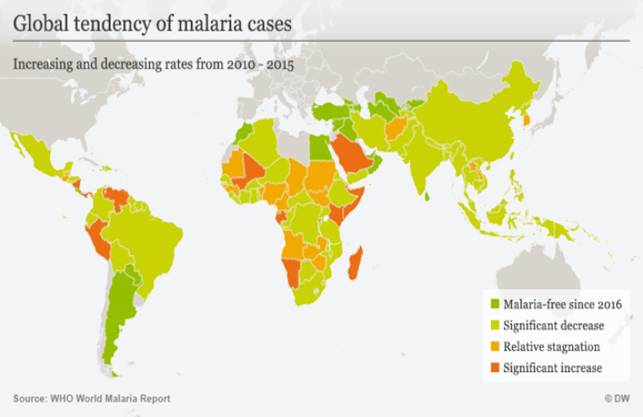 Tuy nhiên, trong giai đoạn từ năm 2014 đến năm 2016, tỷ lệ mắc sốt rét không thay đổi trên phạm vi toàn cầu và gia tăng ở tất cả các khu vực ngoại trừ châu Âu. Tỷ lệ tăng cao nhất là ở khu vực châu Mỹ (36%), nơi mà tỷ lệ mắc bắt đầu tăng từ năm 2013 và phân lớn tăng ở Brazil và Venezuela.