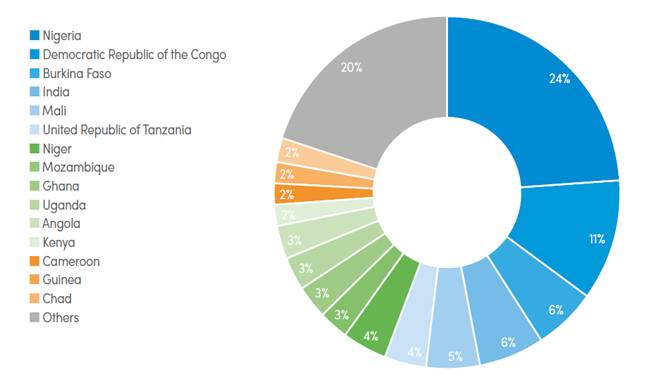 Hình 7. Tỷ lệ tử vong do sốt rét ở 15 quốc gia chiếm gần 80% ca tử vong trên toàn cầu trong năm 2016.