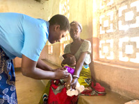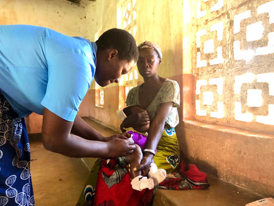 Cô Kanyare đưa bé Muhindo đến phòng khám (WHO / J. D. Kannah)