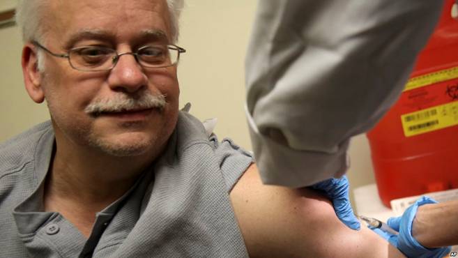 Ảnh: Steve Sierzega tiêm chủng vaccine sởi, quai bị và rubella tại Sở y tế hạt Rockland ở Pomona, N.Y., ngày 27 tháng 3 năm 2019.