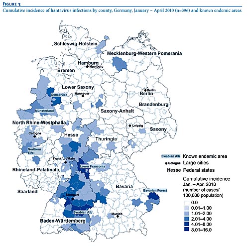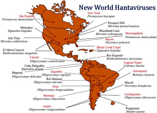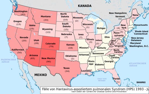 Đến tháng 7.2007 có 6 bang báo cáo nhiễm Hantavirus kể từ năm 1993: New Mexico (69), Colorado (49), Arizona (46), California (43), Texas (33) và Washington (31). Các bang khác đang báo cáo với một số ca có ý nghĩa gồm có Montana (25), Idaho (19) và Utah (24). Với chỉ 7 ca, Oregon có tỷ lệ nhiễm bệnh thấp hơn có ý nghĩa trong tất cả và liên quan đến quần thể, so vớicác bang ở phía Tây.