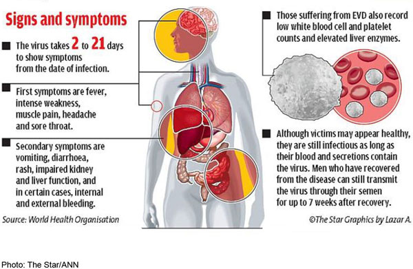 Virus bắt đầu lây nhiễm cho các cơ quan trong cơ thể, giết chết tế bào bên trong và khiến chúng như nổ tung. Tất cả các thành phần của virus sẽ đi vào máu. Hệ miễn dịch bắt đầu phản ứng với tình trạng khủng hoảng nhưng đã quá muộn. Theo Tổ chức Y tế Thế giới, khoảng 70% người nhiễm virus sẽ tử vong, mặc dù việc xác định con số chính xác khi đợt bùng phát dịch vẫn chưa thể kiểm soát là điều không dễ dàng.