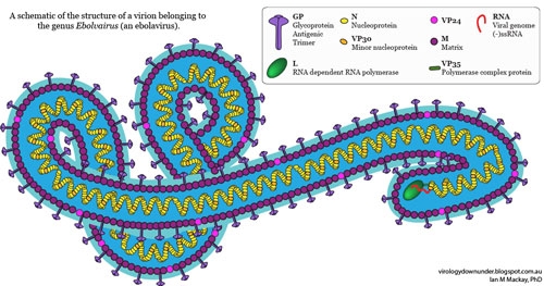 Ebola là filovirus, một loại virus được hình thành từ các chuỗi protein nhỏ bao phủ một dải vật chất di truyền. Đối với cơ thể người nhiễm bệnh, các phần tử hay hạt virus (virion) sống trong máu, nước bọt, chất nhầy, mồ hôi và dịch nôn. Trong giai đoạn bị bệnh ở một người (thường sau 5-6 ngày từ khi nhiễm), một phần năm thìa máu có thể chứa 10 tỷ phần tử virus. Trong khi đó, một bệnh nhân nhiễm HIV nhưng không chữa trị thường có từ 50.000-100.000 phần tử virus trong cùng một lượng máu. Con số này ở người mắc viêm gan C là từ 5-20 triệu.