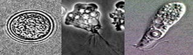 Chu kỳ sinh học với các giai đoạn nang, roi và tư dưỡng (Cyst, Flagellate, Trophozoite).