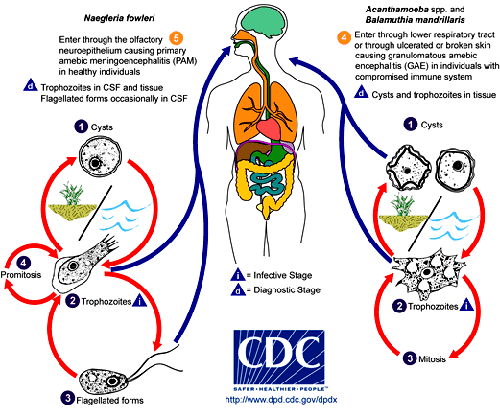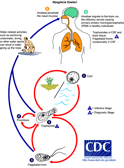 1."The Centers for Disease Control and Prevention, Division of Parasitic Diseases - Naegleria Infection Fact Sheet". http://www.cdc.gov/Ncidod/dpd/parasites/naegleria/factsht_naegleria.htm.