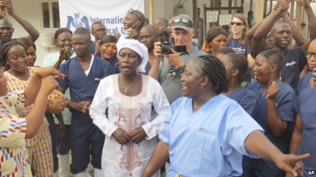 Adama Sankoh, một bệnh nhân sống sót khỏi Ebola, được xuất viện khỏi Trung tâm điều trị Ebola Makheni vào ngày 24 tháng 8 năm 2015, Sierra Leone.