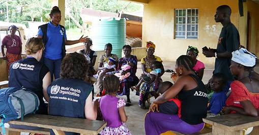 Aziza SAhid, một chuyên gia quan hệ cộng đồng nói với các bà mẹ ở làng Bubuye: “Tại huyện Kambia này trẻ em đang chết dần, chúng tôi-tổ chức WHO không vui với điều này, đó là lý do tại sao chúng tôi tới đây hôm nay”. Các bà mẹ với những đứa trẻ còn bú mẹ hay mới biết đi lắng nghe một cách chăm chú. Aziza khích lệ nhóm này: “Cứ thoải mái nói bất cứ điều gì các bạn biết” (Feel free to say whatever you know).