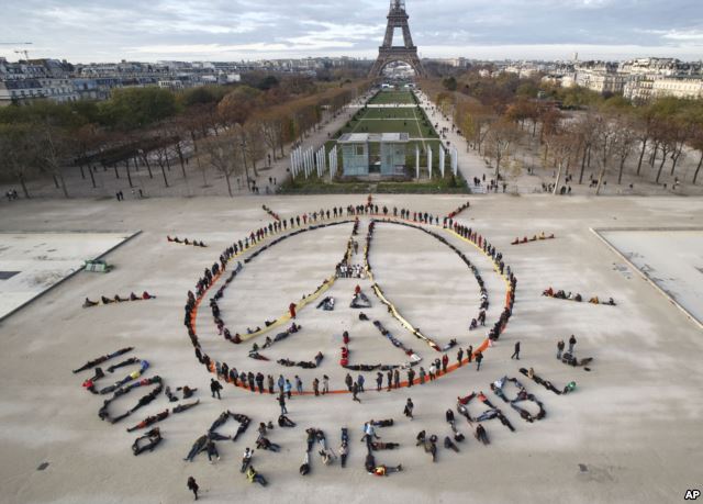 tái tạo được” (100% renewable), bêm thềm hội nghị biến đổi khí hậu COP21 gần Tháp Eiffel tại Pari ngày 6/12/2015.