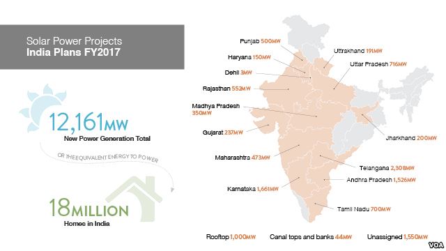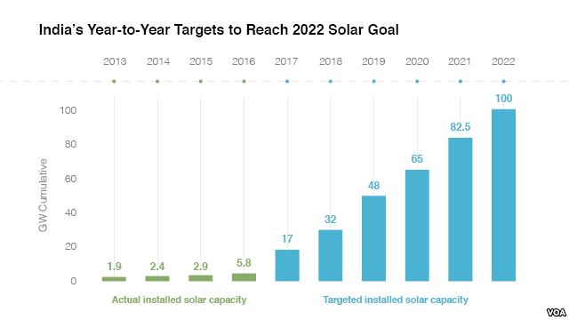 Vào năm 2014, Modi đã đặt ra mục tiêu 100 gigawatt công suất phát điện năng lượng mặt trời tính đến năm 2022-một mục tiêu cực kỳ thách thức vì công suất của toàn thế giới năm đó là 177 GW, và Ần Độ chỉ có 2,4 GW. Chính phủ đã phê duyệt 15GW công suất mới trong năm nay nhưng các mục tiêu dài hạn thì dường như khó khăn hơn để đạt được. Light cho biết: “Cái mà Ấn Độ cần là tài chính, với 240 triệu dân không được tiếp cận với điện hiện nay Ấn Độ về cơ bản có thị trường tiêu thụ điện trong nước lớn nhất trên thế giới. Đây là một cơ hội đầu tư khổng lồ”. Tuy nhiên, các nhà đầu tư không hề hăng hái nhảy vào môi trường kinh doanh phức tạp của Ấn Độ, Light chỉ ra rằng các nỗ lực chính phủ Hoa Kỳ và Ấn Độ đang “là quá ít để xử lý vấn đề quan trọng và vô cùng then chốt này, sự tiến triển cũng quá chậm”.
