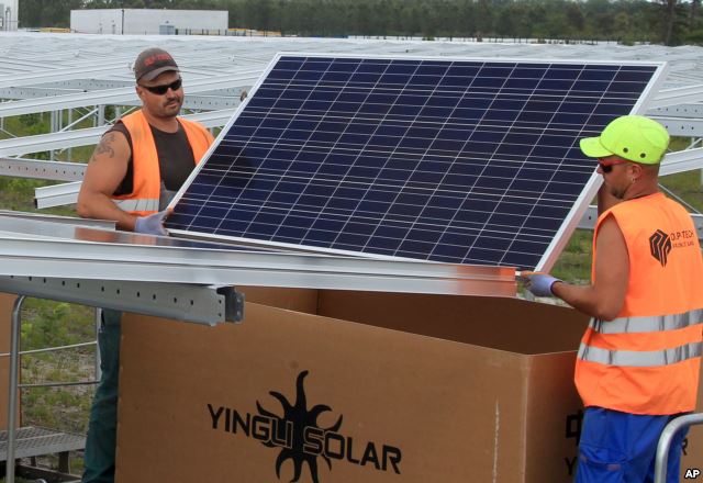 Các công nhân lắp đặt các tấm pin mặt trời tại nhà máy quang điện Costantine tại Cestas, gần Bordeaux, tây nam nước Pháp.