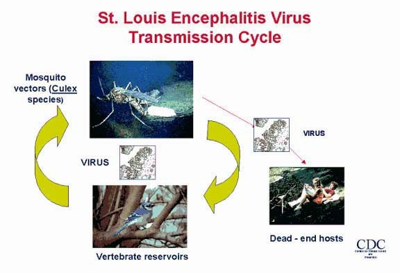 Bệnh viêm não St. Louis được gây ra do một loại virus thông qua muỗi đốt. Trong tất cả các laòi muỗithì chỉ có một nhóm nhỏ có khả năng lan truyền bệnh viêm não này và ngay cả trong mùa dịch thì chỉ có < 1% số muỗi này bị nhiễm virus mà thôi. Hầu hết người bị nhiễm virus đều phát triển thành một hội chứng giống cúm và nhức đầu nhiều. chỉ 1% người bị nhiễm mới phát bệnh nặng với bệnh cảnh viêm não hoặc viêm màng não vô trùng do phản ứng viêm não bộ, trong số những ca ác tính đó thì 7% tử vong. Nếu trên người lớn tuổi thì bệnh sẽ nghiêm trọng hơn, dễ chuyển sang viêm não và có thể tử vong rất sớm.