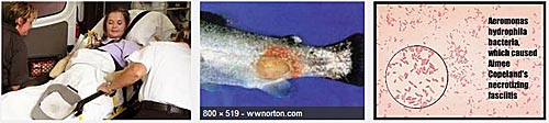 Người ta gọi là “vi khuẩn ăn thịt người”, có lẽ do vi khuẩn AH gây hoại tử da, cân cơ, cơ, suy đa phủ tạng và nhiễm khuẩn huyết một cách nhanh chóng. Từ năm 1962, ở Mỹ đã xuất hiện những bệnh nhân đầu tiên với biểu hiện bệnh rất mệt mỏi, hoại tử da, cơ của chân, tay, mặt, gây sốc nhiễm trùng, nhiễm khuẩn huyết, thậm chí có ca tử vong, với căn nguyên gây bệnh được xác định là vi khuẩn Aeromonas hydrophyla (vi khuẩn ăn thịt người).