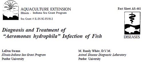 Aeromonas hydrophila liên quan đến bệnh chủ yếu tìm thấy trong cá nước ngọt và loài lưỡng cư, vì các vi sinh vật này sống trong môi trường nước. Nó còn liên quan đến bệnh tìm thấy trong các ếch gọi là chân đỏ, gây bệnh nội tạng, đôi khi nhìn thấy xuất huyết tử vong. Khi nhiễm với Aeromonas hydrophila, cá xuất hiện các vết loét, thối rửa đuôi cá, vây cá và nhiễm trùng xuất huyết.. Nhiễm trùng xuất huyết dẫn đến các thương tổn và dẫn đến bóc tách ra, xuất huyết trên các vùng hậu môn và mang cá, các vết loét, lồi mắt và sưng phồng bụng.