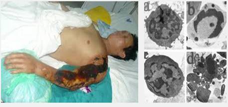 Trước đó, bệnh nhân có biểu hiện sốt, một ngày sau sưng nề ở cẳng tay trái và lan ra khắp cánh tay và lên vai. Sau 10 ngày điều trị, bệnh nhân thoát khỏi tình trạng sốc và nhiễm khuẩn huyết nhưng hoại tử toàn bộ da cánh tay bên trái. Cùng như trường hợp bệnh nhân ở Nam Định, người này được chuyển đến viện Bỏng quốc gia để ghép da.