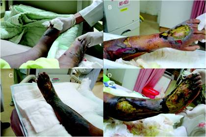 Đến ngày 15/5, bà Jũng nhập viện trong tình trạng sốc nhiễm trùng nặng, viêm hoại tử lan tỏa từ khớp gối xuống hết bàn chân phải, toàn bộ cẳng chân phải sưng nề, da đổi màu tím như quả sim, cẳng chân sưng đau, bệnh nhân kêu la dữ dội.
