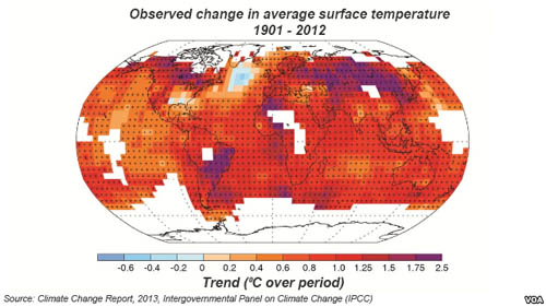 Các nhà từ chối biến đổi khí hậu đã cố gắng bỏ qua khoa học, trích dẫn một sự giảm chậm 15 năm trong sự nóng lên của khí quyển (slowdown in atmospheric warming). Điều đó được đánh giá thấp trong các báo cáo gọi nó là một hiện tượng tự nhiên mà che dấu sự ấm lên liên tục (on-going warming). Báo cáo nhắc lại các đánh giá năm 2007 là xu hướng nóng lên là "rõ ràng" (unequivocal): "Báo cáo đánh giá lần thứ 5 đã thực sự ghi được mức độ tin cậy rằng hơn 95% độ tin cậy về khả năng rằng sự ấm lên đã xảy ra trên hành tinh này từ năm 1951 đến 2010, hơn một nửa trong số đó là do các hoạt động của con người". Những hoạt động của con người bao gồm việc đốt các nhiên liệu hóa thạch trong các nhà máy, các tòa nhà và xe hơi phát ra khí bẫy nhiệt (heat-trapping gasses).