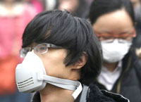 | Một người đàn ông dắt theo con chó của mình, cả hai mang khẩu trang đi bộ dọc theo một con hẻm nhỏ vào một ngày mờ khói ở Bắc Kinh, ngày 23/2/2014 |