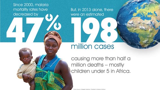 WHO ước tính khoảng 2,1 triệu người nhiễm mới HIV vào năm 2015, thấp hơn 35% so với số người nhiễm mới HIV trong năm 2000 (khoảng 3,2 triệu);khoảng 212 triệu trường hợp sốt rét trên toàn cầu vào năm 2015,khoảng 60% dân số có nguy cơ tiếp cận với màn tẩm hóa chất diệt muỗi (ITNs) vào năm 2015 so với 34% trong năm 2010.