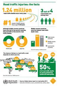 Tài liệu số 358 (Fact sheet N°358) của WHO cập nhật tháng 10/2015 cho biết một số thông tin chính như có khoảng 1,25 triệu người tử vong mỗi năm do các vụ tai nạn giao thông; các chấn thương tai nạn giao thông là nguyên nhân hàng đầu gây tử vong ở người trẻ tuổi, độ tuổi từ 15-29 tuổi; 90% số ca tử vong trên thế giới do tai nạn giao thông xảy ra ở các nước thu nhập trung bình và thấp, dù những quốc gia này chỉ có xấp xỉ một nửa số phương tiện giao thông của thế giới; một nửa số người tử vong do tai nạn giao thông là “những người tham gia giao thông dễ bị tai nạn” (vulnerable road users) như người đi bộ, người đi xe đạp và người đi xe mô-tô; nếu không hành động, các vụ tai nạn giao thông được dự báo sẽ vươn lên trở thành nguyên nhân gây tử vong đứng thứ 7 tính đến năm 2030.