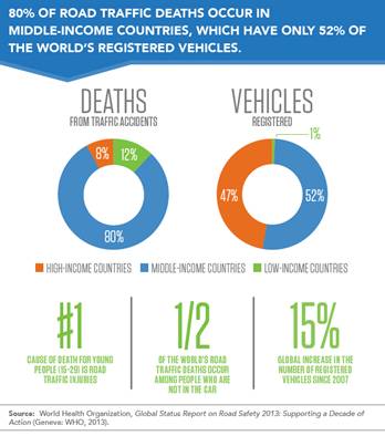 "Báo cáo tình trạng toàn cầu về an toàn giao thông năm 2015" của WHO trình bày các thông tin về an toàn đường bộ từ 180 quốc gia là báo cáo thứ ba trong loạt các báo cáo và cung cấp một cái nhìn tổng quan về tình hình an toàn giao thông trên toàn cầu, các báo cáo tình trạng toàn cầu là các công cụ chính thức để theo dõi Thập kỷ hành động vì an toàn đường bộ giai đoạn 2011-2020.