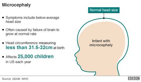 Bệnh đầu nhỏ (Microcephaly) các triệu chứng gồm có kích thước đầu dưới mức trung bình, thường gây ra thiếu khả năng của não để phát triển đến tỷ lệ bình thường; chu vi của đầu đo nhỏ hơn 31,5-32cm lúc mới sinh; gây ảnh hưởng đến 25.000 trẻ em ở Mỹ mỗi năm. Đó là khi một đứa bé sinh ra mắc bệnh đầu nhỏ khác thường, não của chúng không phát triển phù hợp, mức độ nghiêm trọng khác nhau nhưng nó có thể gây tử vong nếu não chậm phát triển đến nỗi không thể điều chỉnh các chức năng cần thiết cho cuộc sống, những đứa trẻ sống sót mắc khuyết tật trí óc và chậm phát triển có thể gây ra do các bệnh truyền nhiễm như rubella, lạm dụng thuốc trong quá trình mang thai hay bất thường do gen. Brazil có ít hơn 150 ca bệnh đầu nhỏ trong năm 2014 nhưng có hơn 3500 ca bệnh được báo cáo kể từ tháng 10/2015 có liên quan đến virus Zika hay không chưa được xác định nhưng một vài em bé tử vong có virus trong não và không có giải thích nào khác cho việc gia tăng bệnh đầu nhỏ được đưa ra.