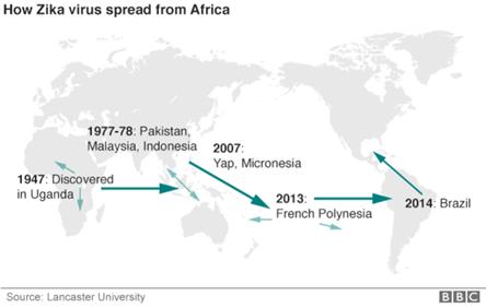 Ngày 25/01/2016. BBC News. Virus Zika: Tổ chức Y tế thế giới (WHO) cho biết 'dịch bệnh có khả năng lây lan khắp châu Mỹ' (Zika virus: Outbreak 'likely to spread across Americas' says WHO). Tổ chức này cảnh báo virus Zika có khả năng lây lan hầu như khắp châu Mỹ-căn bệnh gây ra các triệu chứng bao gồm sốt nhẹ, đau khớp và đau đầu được phát hiện tại 21 quốc gia ở vùng Ca-ri-bê, Bắc Mỹ và Nam Mỹ, chưa có thuốc điều trị đặc hiệu hay vắc-xin sẵn có. Virus này lần đầu tiên được phát hiện ở khỉ vào năm 1947 tại châu Phi, từ đó xuất hiện các vụ dịch nhỏ, thời gian ngắn ở người tại châu lục này cùng một số khu vực ở châu Á và các đảo thuộc Thái Bình Dương. Tuy nhiên, nó lây lan trên phạm vi lớn ở châu Mỹ, nơi mà sự lan truyền lần đầu tiên được phát hiện ở Brazil vào tháng 5/2015, số lượng lớn muỗi mang virus và thiếu khả năng miễn dịch tự nhiên được cho là làm bệnh truyền nhiễm lan rộng nhanh chóng.