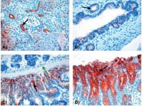 (B)Trình diện miễn dịch yếu các cytokeratin (mũi tên đen) trong bào tương các tế bào biểu mô của ống mật chủ cả các con chuột chứng;