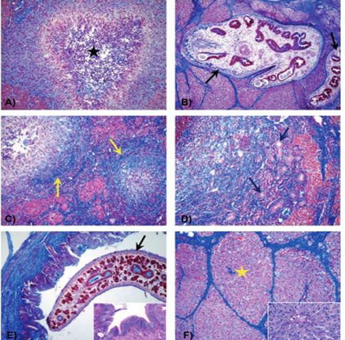(C) Tăng sinh sợi collagen (mũi tên vàng) quanh các vết di chuyển ở gan lúc 4 tuần sau nhiễm;