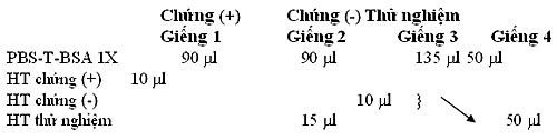 Tiến hành phản ứng: Với 1 huyết thanh thử nghiệm chỉ dùng 1/2 thanh gồm 4 giếng ELISA, với 3 huyết thanh thử nghiệm, dùng 1 thanh 8 giếng ELISA.