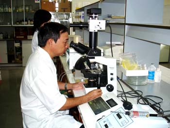 TS Nguyễn Văn Chương, Phó Viện trưởng đang sử dụng kính hiển vi chụp ảnh hình thể ký sinh trùng tại labo của Viện |