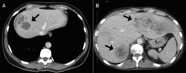 +Abces gan do vi khuẩn hoặc do amíp: đau vùng thượng vị lan rộng sang các vùng bên cạnh, đau hạ sườn phải, đau lên ngực, đau khiến cho bệnh nhân không dám thở mạnh; sốt cao, môi khô, lưỡi bẩn..., trong những tình huống như thế cần thiết phải kết hợp lâm sàng, tiền sử bệnh (có viêm đại tràng amíp trước đó,…) có huyết thanh chẩn đoán amíp, siêu âm có hình ảnh điển hình phân biệt với tổn thương SLGL, xét nghiệm phân có amíp hiện diện, công thức bạch cầu tăng;