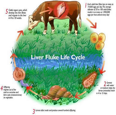 Nói tóm lại, về chu kỳ của bệnh sán lá gan lớn để hoàn thành, F. hepatica và F.gigantica đòi hỏi có mặt ốc đặc hiệu trong nước đóng vai trò như vật chủ trung gian là loài ốc Lymnaea truncatula, hoặc loài ốc khác ở đó ký sinh trùng có thể sinh sản giai đoạn vô tính. Từ ốc, một vài cercariae lồi ra và bơi trong vũng nước, đóng kém gọi là metacercariae. Từ đây, metacercariae được các động vật ăn vào, trong một số trường hợp người ăn các thực vật thủy sinh chưa nấu chín sẽ tạo chu trình nhiễm. Tiếp xúc với độ pH thấp trong dạ dày tạo ra thể trẻ non chưa trưởng thành để bắt đầu cho quá trình thoát kén. Trong tá tràng, ký sinh trùng vở ra tự do xuất hiện nhiều metacercariae, chúng đào hầm và nằm dưới lớp niêm mạc ruột, rồi tiếp đến đi vào trong khoang phúc mạc. Các thể trẻ vừa mới thoát kén không ăn ở giai đoạn này nhưng một khi tìm đến được nhu mô gan (vài ngày sau đó), chúng sẽ bắt đầu ăn các thức ăn. Giai đoạn trong nhu mô gan này gọi là giai đoạn gây bệnh (pathogenic stage), gây nên thiếu máu, triệu chứng lâm sàng. Ký sinh trùng bắt đầu gây tổn thương lan tỏa khắp gan sau đó 5-6 tuần và cuối cùng tiìm đường đi vào trong ống mật nơi đó chúng sẽ trưởng thành và bắt đầu đẻ trứng. Lượng trứng có thể đẻ lên dến 25.000 trứng mỗi ngày từ một con sán hoặc nếu nhiễm nhẹ có thể đẻ 500.000/ ngày.