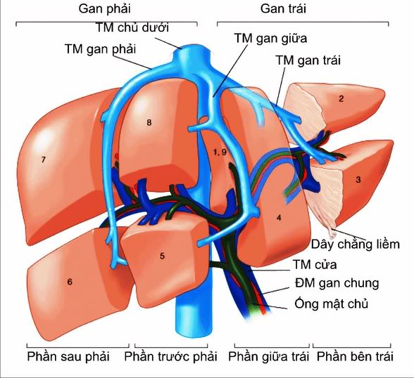 Hình 1c. Sự phân chia các thùy gan dựa theo các tĩnh mạch gan