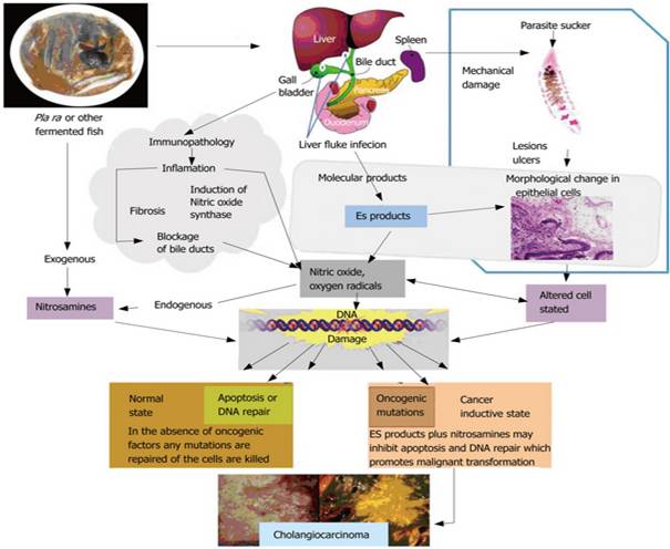 Liver fluke induces cholangiocarcinoma.Sripa B, Kaewkes S, Sithithaworn P, Mairiang E, Laha T, Smout M, Pairojkul C, Bhudhisawasdi V, Tesana S, Thinkamrop B, Bethony JM, Loukas A, Brindley PJ.PLoS Med. 2007 Jul;4(7):e201. Review. No abstract available. PMID: 17622191 Free PMC Article Similar articlesSelect item 8167103149.